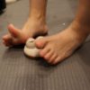 後ろに足の裏を向けて、小刻みに揺らしています。つま先を深く折り曲げたときに、足の裏に