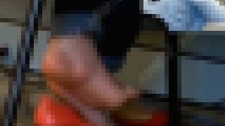 ある公共施設で勉強している女子大生のパンプス脱ぎです。最初の踵だけパカっと出した状態から徐々に大きく脱いでいきます。一瞬、全部脱いでカー...
